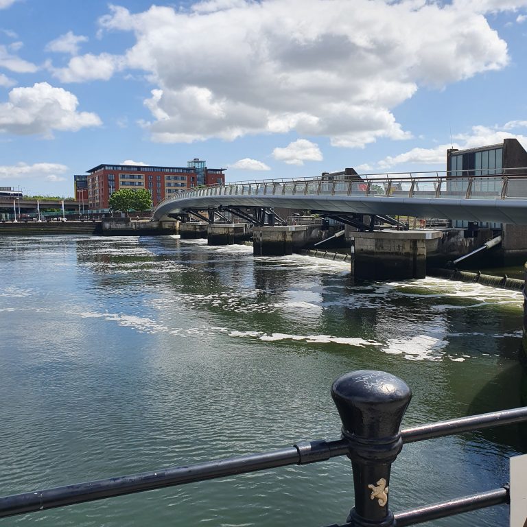 The Lagan Weir opened in 1994. Prior to its construction, mudflats would be exposed at low tide that were unsightly and emitted a strong odour in the summer months. The weir also incorporates a footbridge.