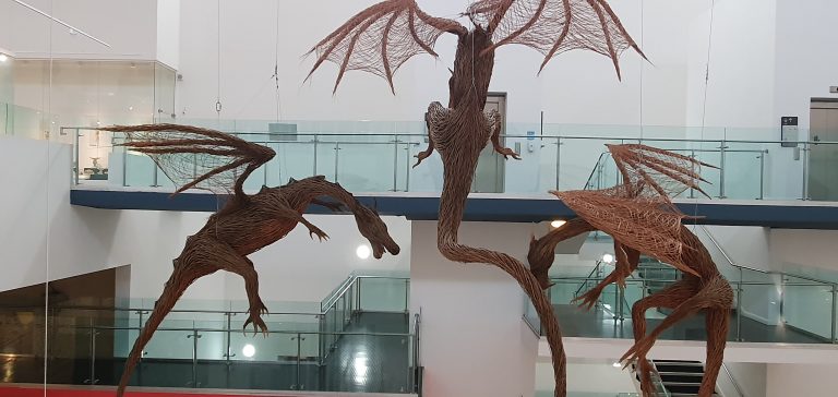Three wicker dragons made from willow are suspended in flight above the main atrium of the Ulster Museum. The dragons were made by master basket weaver Bob Johnson for an event to celebrate the end of filming for the HBO…
